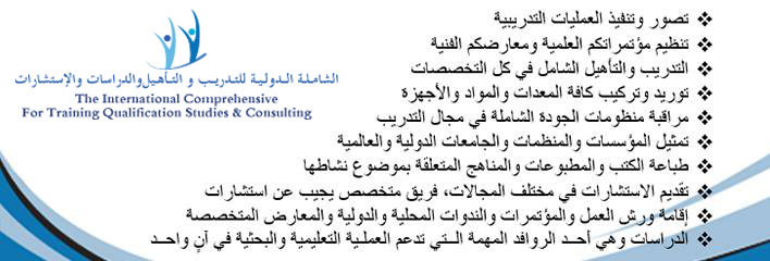 تصور وتنفيذ العمليات التدريبية تأسيس ومراقبة منظومات الجودة الشاملة في مجال التدريب تنظيم مؤتمراتكم العلمية ومعارضكم الفنية